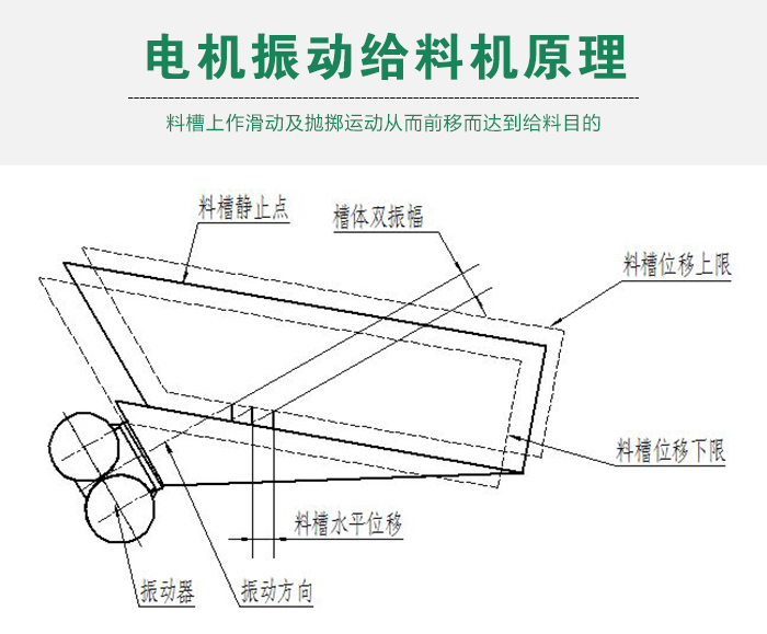 電機振動給料機激振器個是由二特定位置的偏心軸以齒輪相嚙合組成,裝配時必須使兩齒輪按標記相嚙合,通過電機驅動,使兩偏心軸旋轉,從而產生巨大合成的直線激振力,使機體在支承彈簧上作強制振動,物料則以此振動為動力,在料槽上作滑動及拋擲運動,從而使物料前移而達到給料目的。