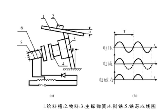 電磁振動給料機是一個較為完整的雙質點定向強迫振動的彈性系統, 整個系統工作在低臨界共振狀態,主要利用電磁激振器驅動槽體以一定的傾角做往復振動,使物料沿槽移動。為電磁振動給料機的工作原理。